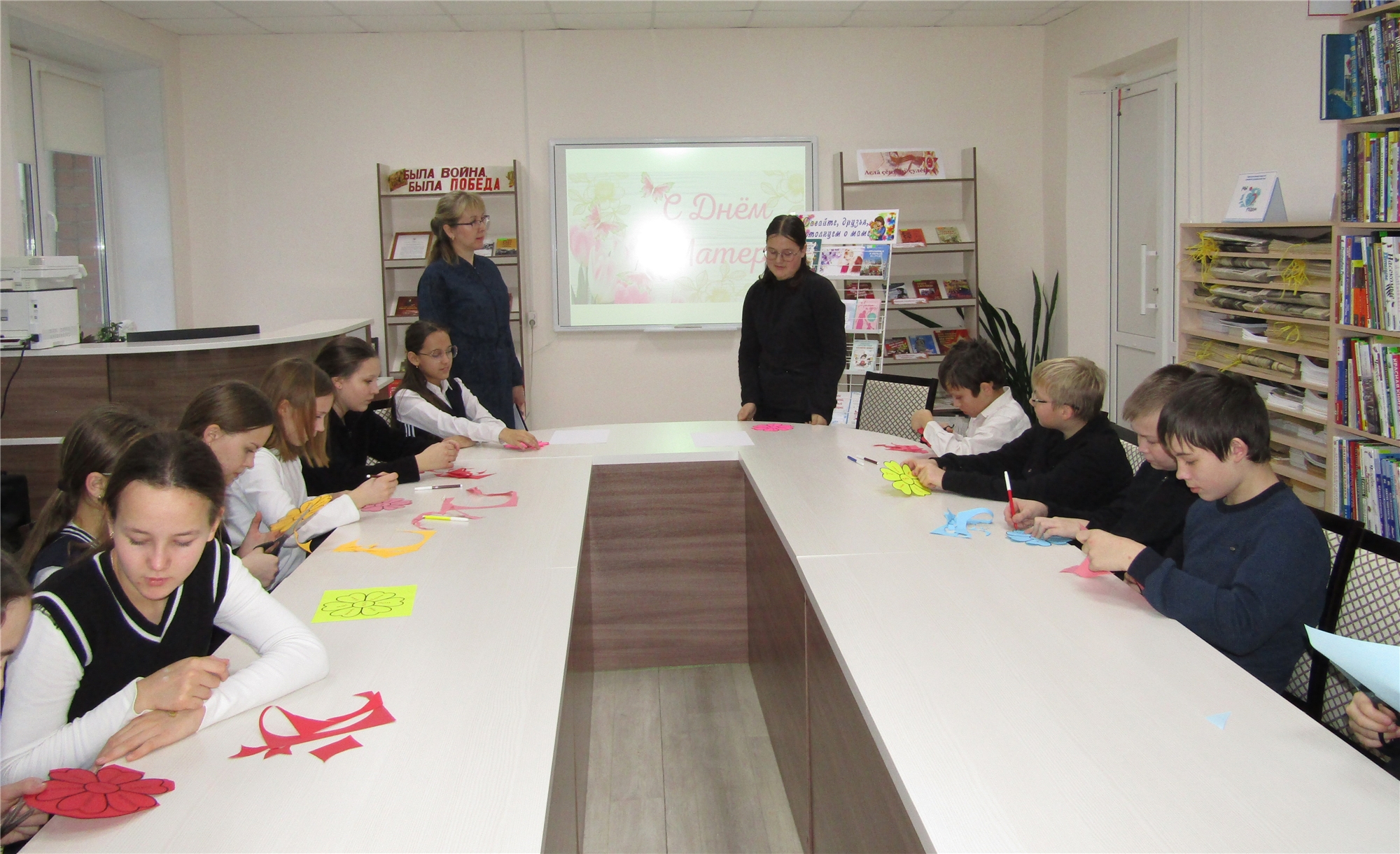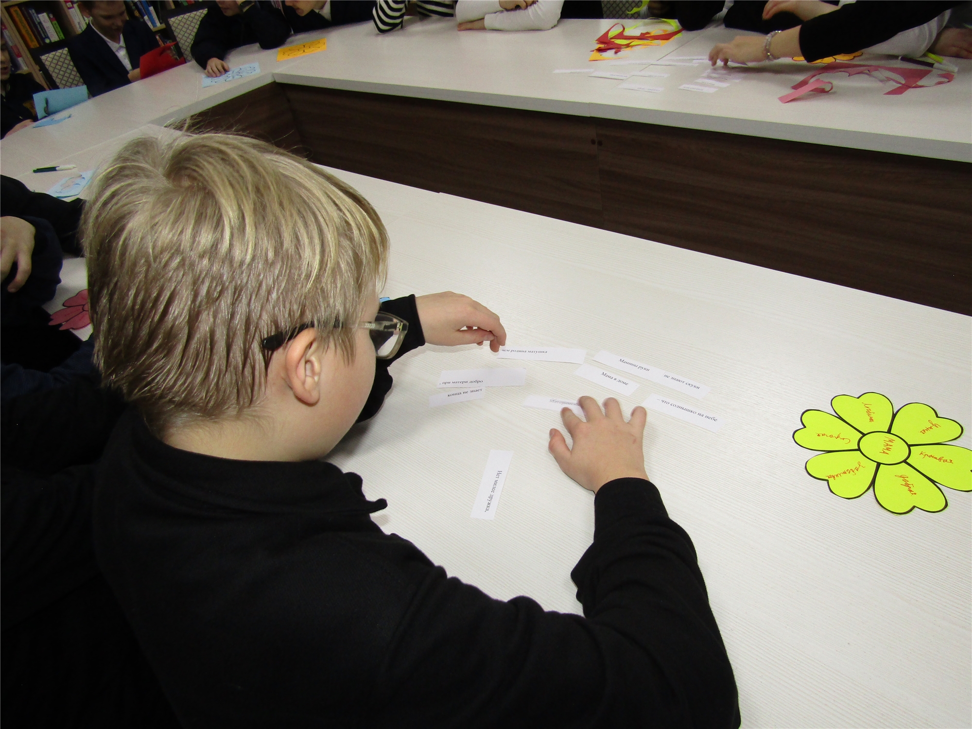 В начале вечера все посмотрели познавательный видеоролик об истории празднования Дня матери, который настроил на торжественно‑домашний лад. Затем на распечатанных цветных листочках в форме цветка дети писали слова, какими они видят своих мам — доброта, забота, поддержка, нежность и другие тёплые эпитеты украсили «букет» из пожеланий.