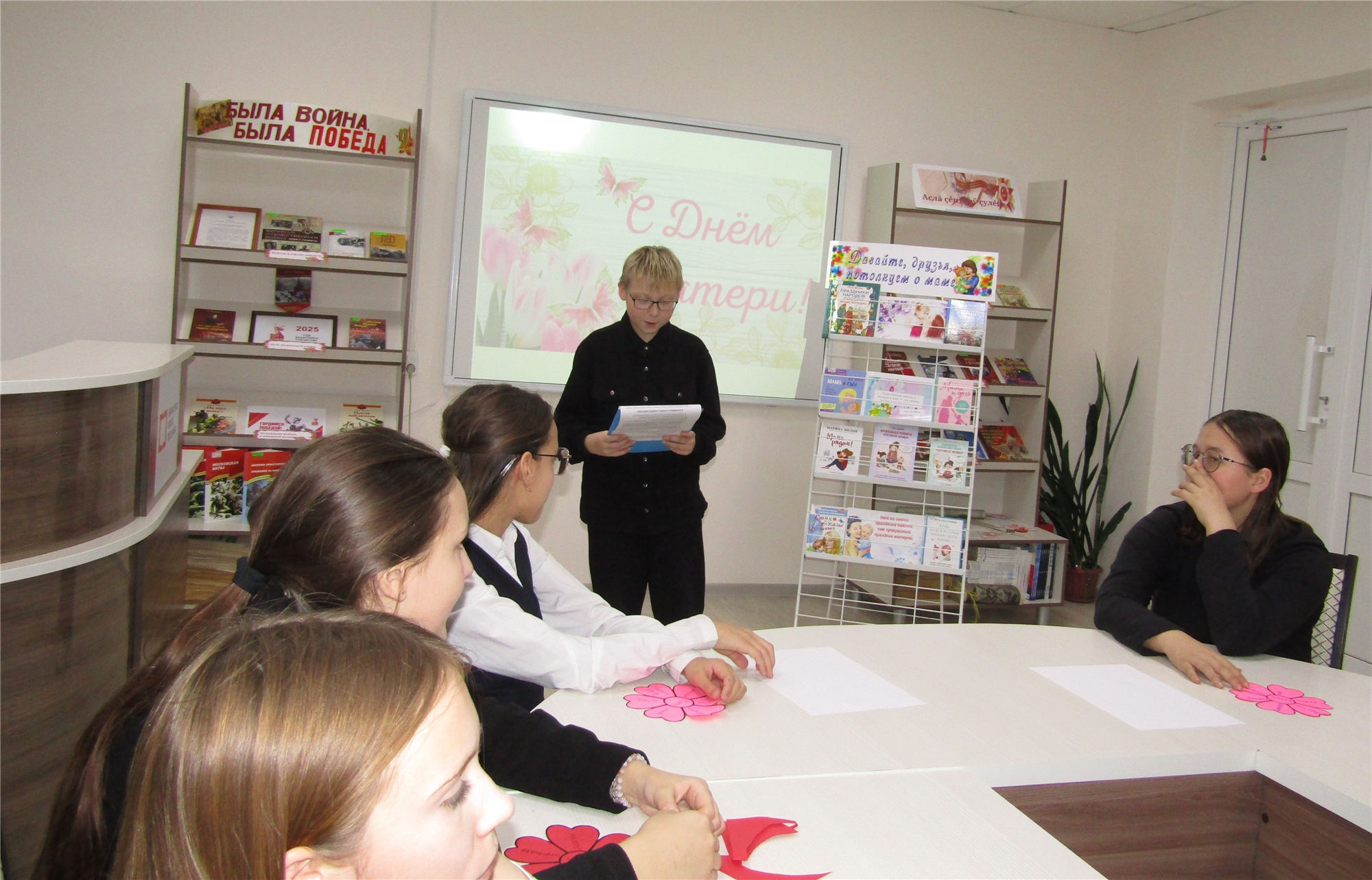К мероприятию была подготовлена тематическая книжная выставка «Давайте друзья потолкуем о маме», где представлены самые тёплые книги про мам.