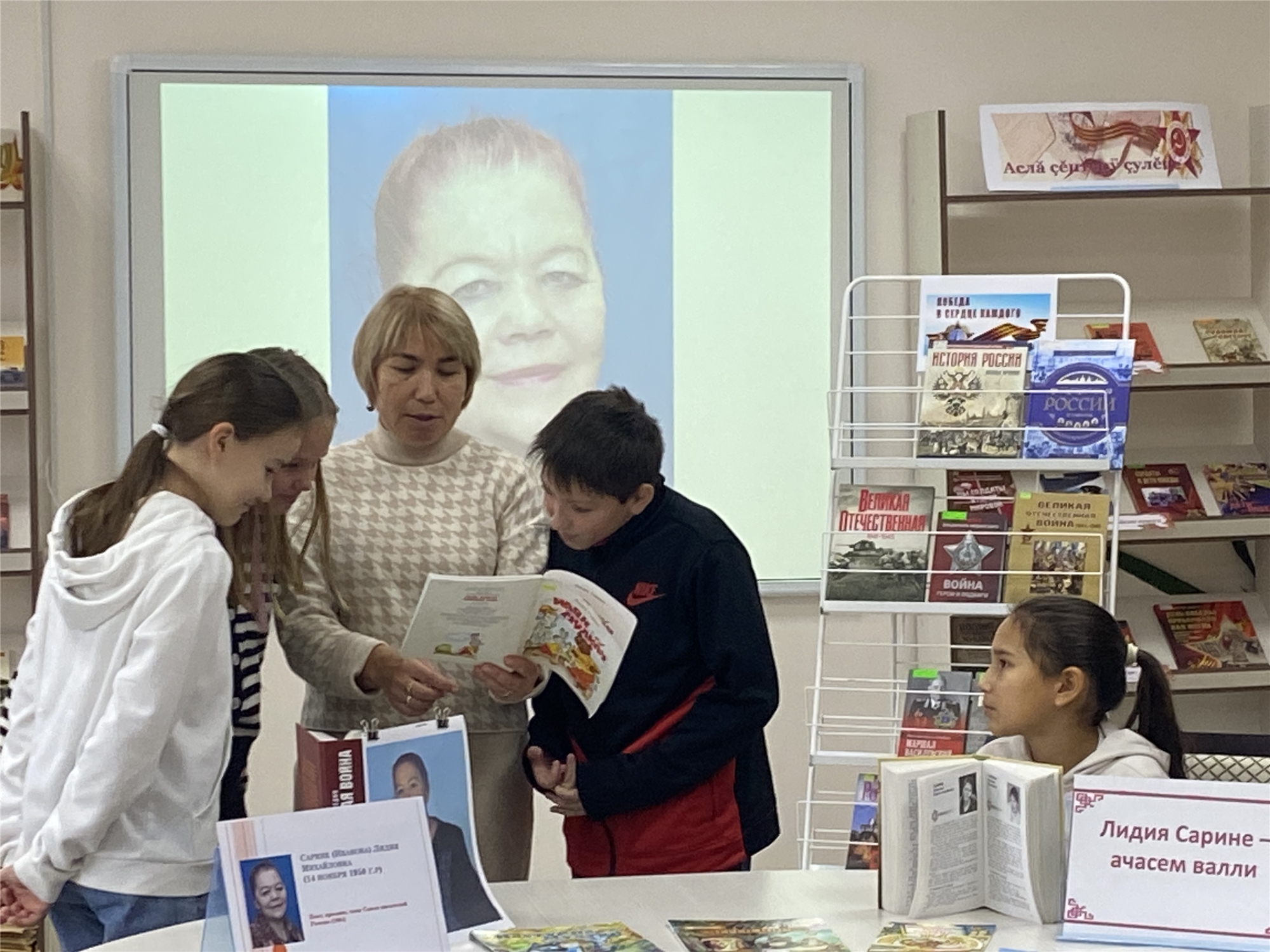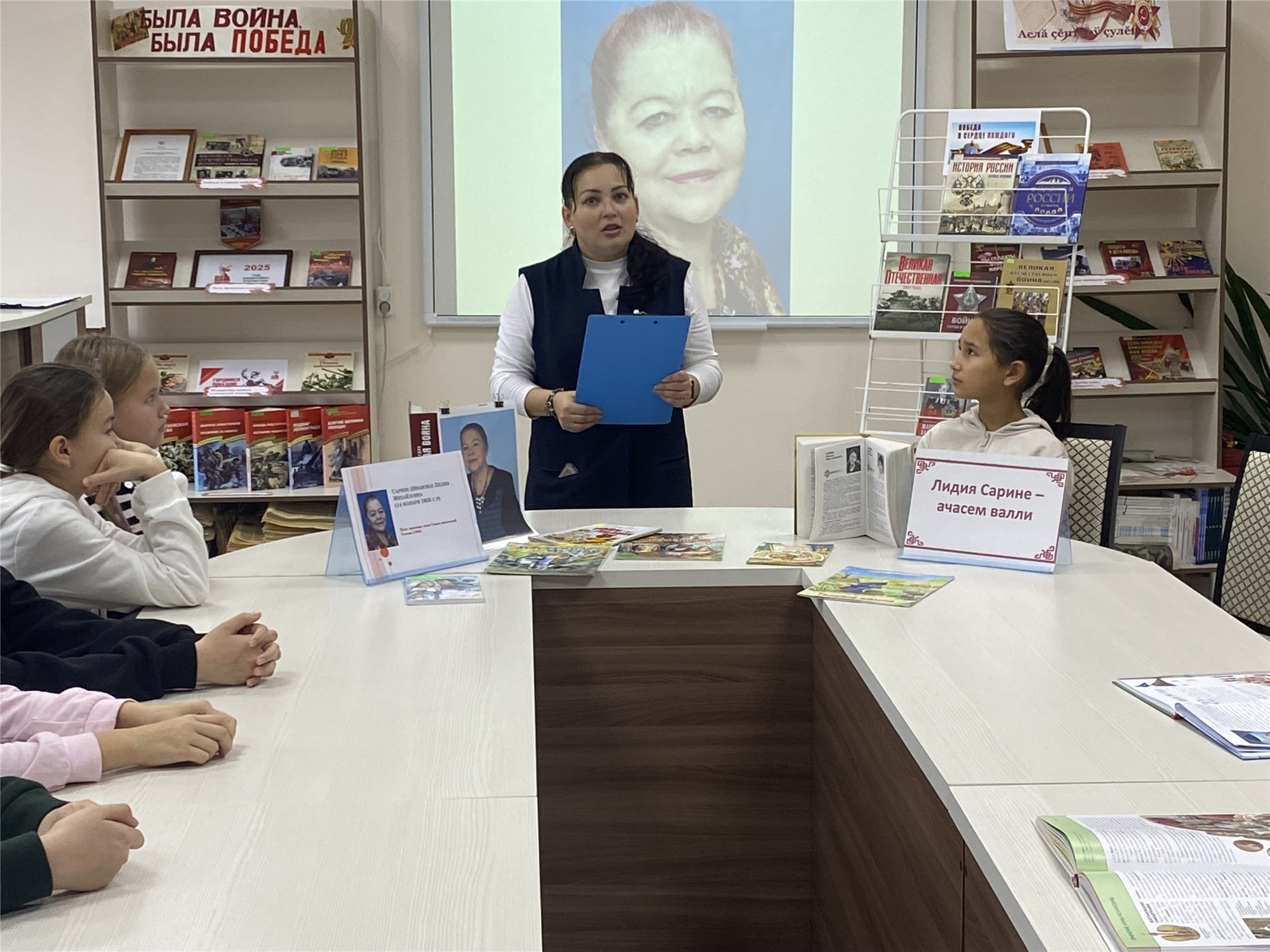 11 ноября в Аликовской центральной библиотеке в рамках проекта Главы Чувашской Республики «Ярко в Чувашии» прошел литературный час «Лидия Сарине – ачасен юратнă ҫыравҫи» к 75 -летию со дня рождения чувашской писательницы Лидии Михайловны Сарине. На мероприятие были приглашены учащиеся 5 и 6 классов МБОУ «Аликовская СОШ им. И. Я. Яковлева».