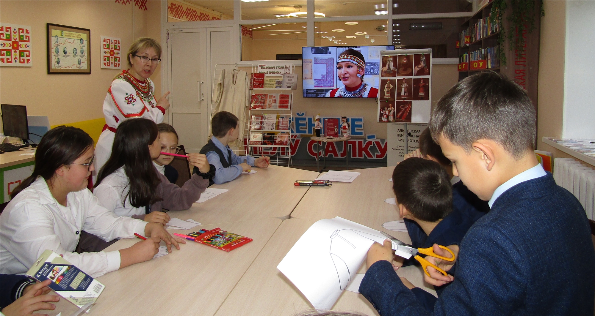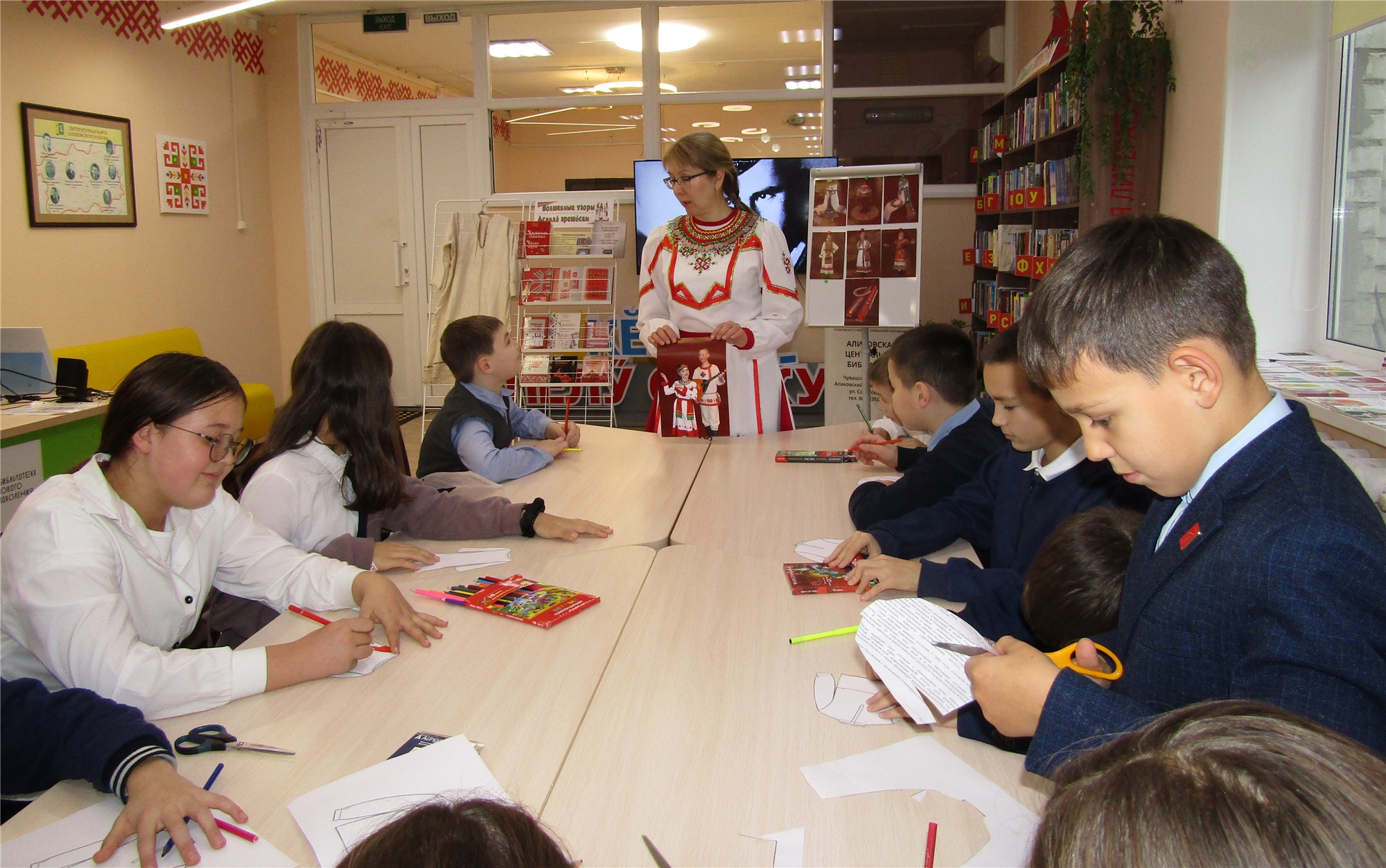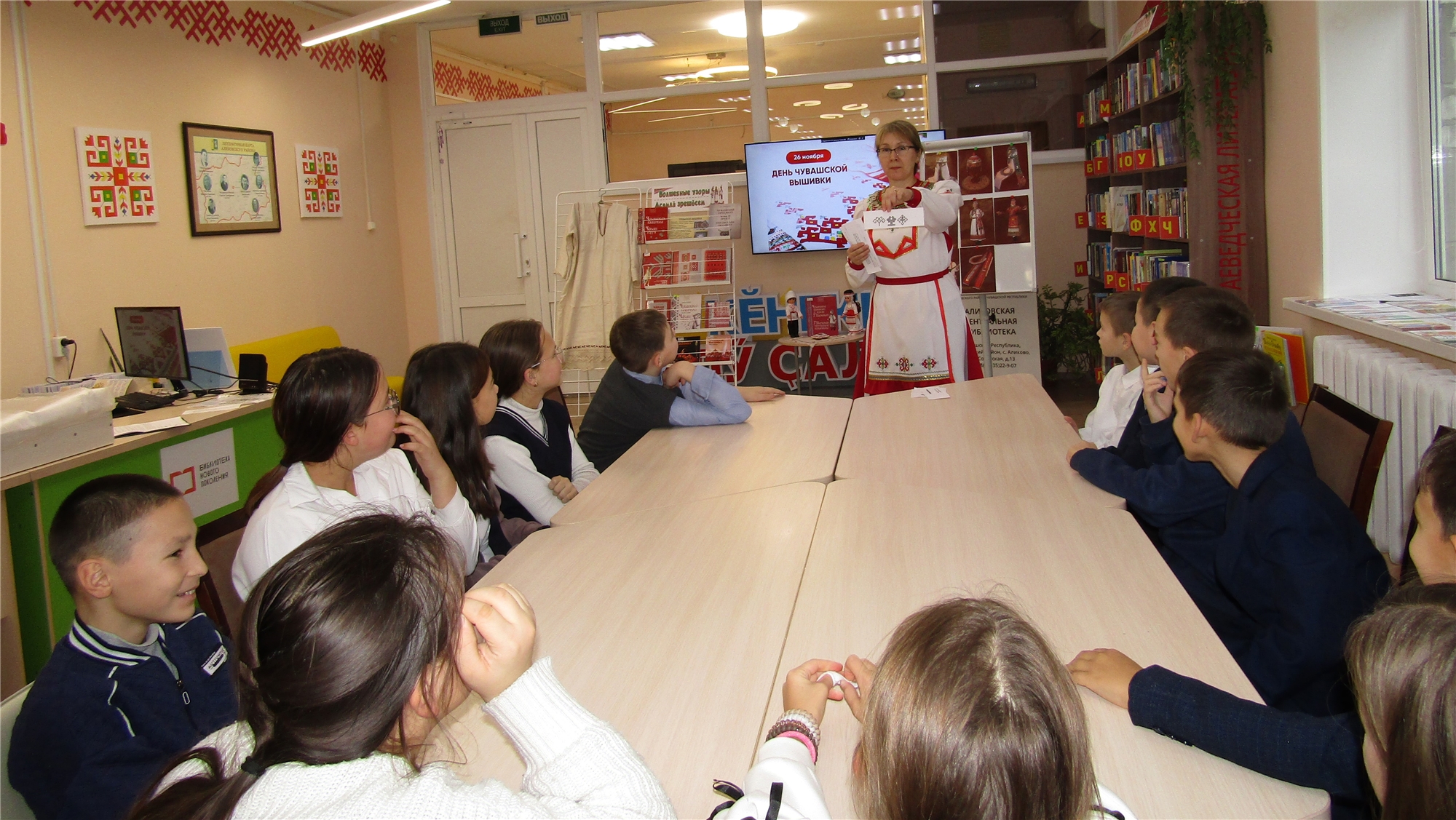 Сотрудник библиотеки познакомила учащихся с историей возникновения вышивки, объяснила детям значение некоторых чувашских узоров: какие из них выступают в роли оберегов, какие символизируют природу и плодородие, где встречаются солнечные и растительные мотивы. Также ребята познакомились с составными элементами чувашского костюма и узнали, чем отличаются костюмы верховых, низовых и средненизовых чувашей, посмотрели видеоролик «Узоры земли чувашской».