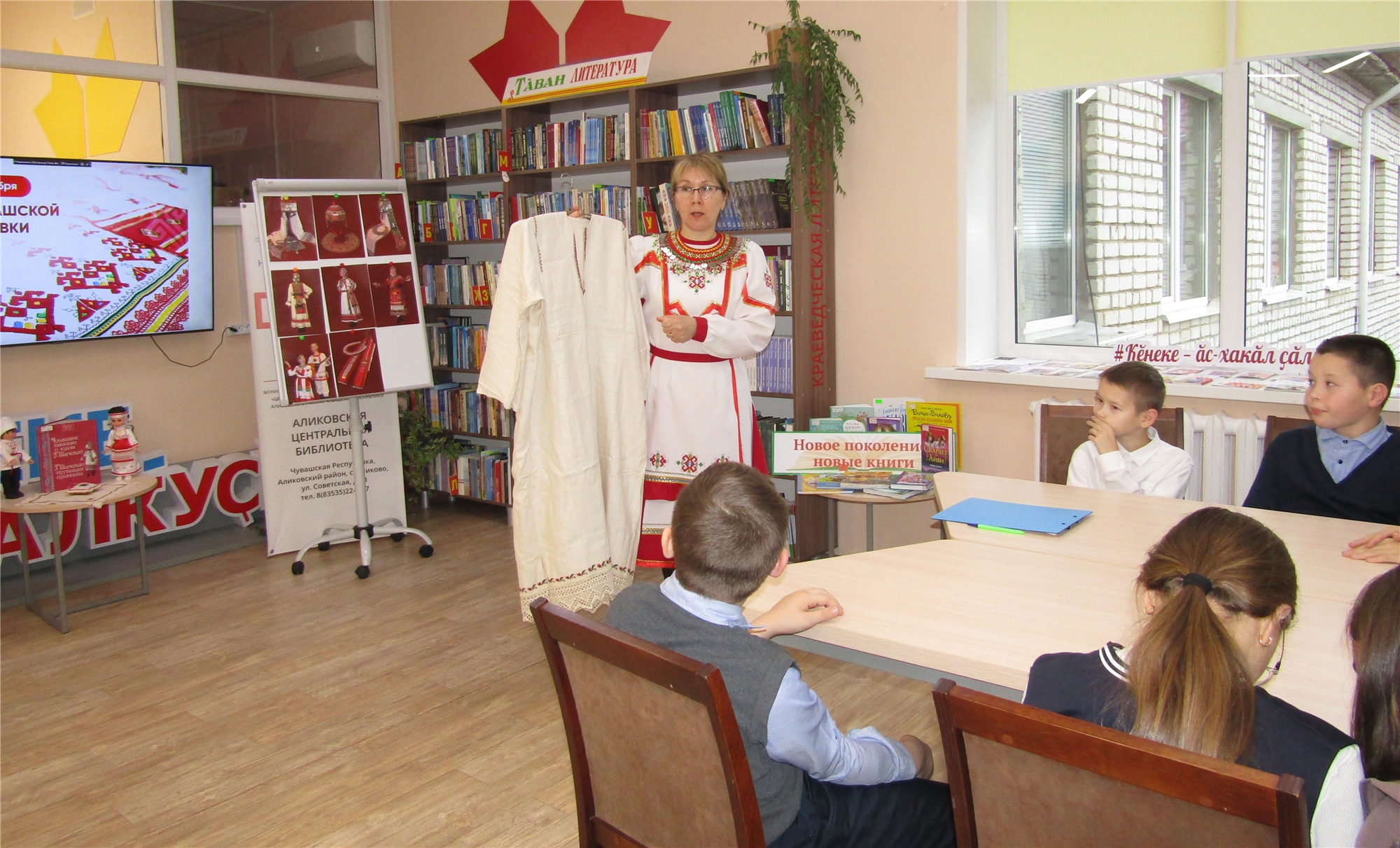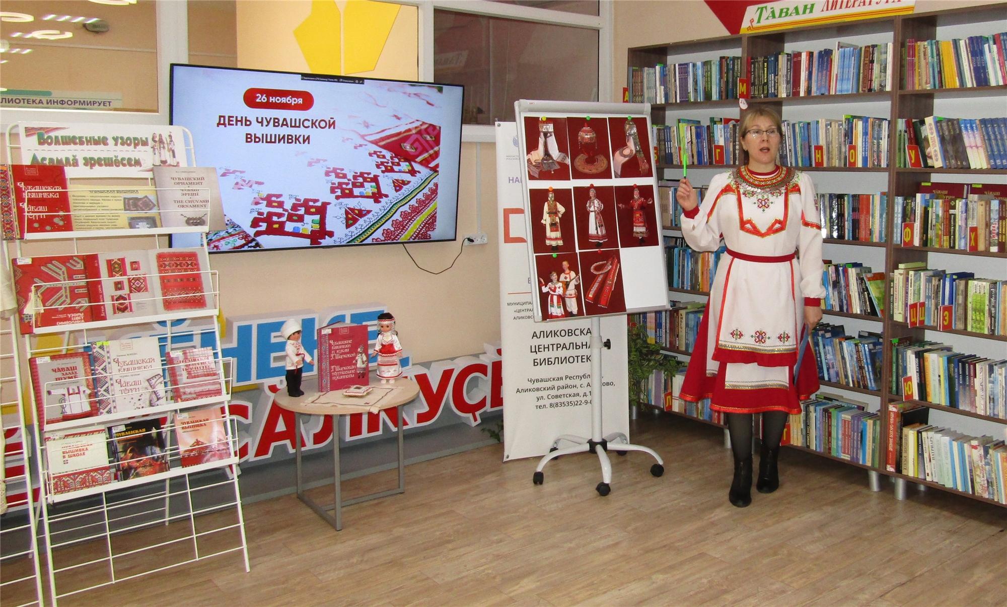 В преддверии празднования Дня чувашской вышивки в рамках проекта Главы ЧР "Ярко в Чувашии" в Аликовской центральной библиотеке прошел устный журнал «Тайны чувашских узоров». На мероприятие были приглашены обучающиеся 5 и 7 классов МБОУ «Аликовская СОШ им. И. Я. Яковлева» с педагогом родного языка и литературы Ириной Валериановной Николаевой.