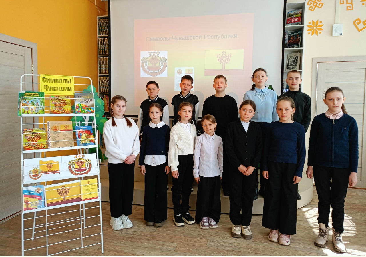 Встреча сопровождалась просмотром видеоролика «Государственные символы Чувашской Республики» и обзором книг с выставки «Символы Чувашии». Дети узнали, что автором герба и флага является художник Э.М. Юрьев, а музыку к гимну написали Г.С. Лебедев и И.С.Тукташ.