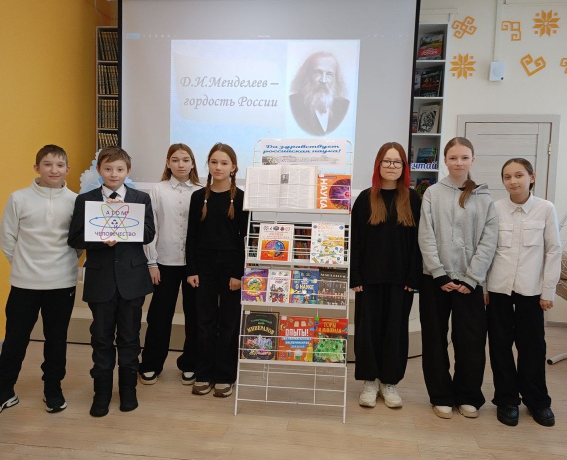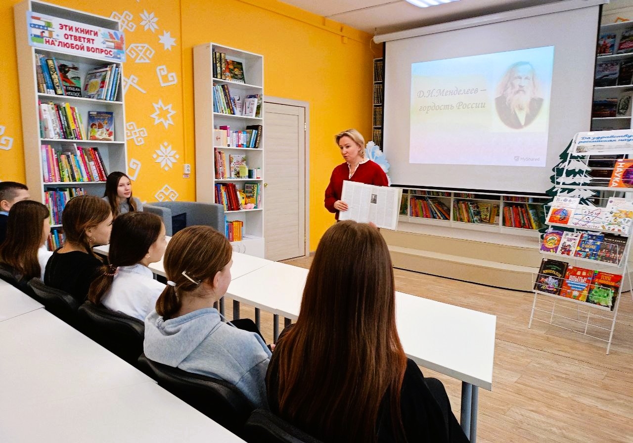 В преддверии этого знаменательного дня Аликовская детская библиотека распахнула свои двери для учеников 6 «Б» класса Аликовской СОШ им. И.Я. Яковлева. Сотрудник библиотеки провела для ребят увлекательный познавательный урок под названием «Дмитрий Менделеев – гордость России!».