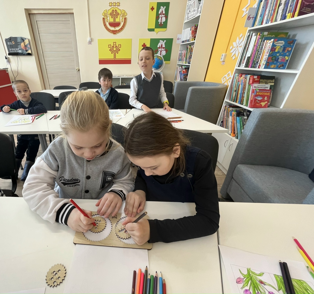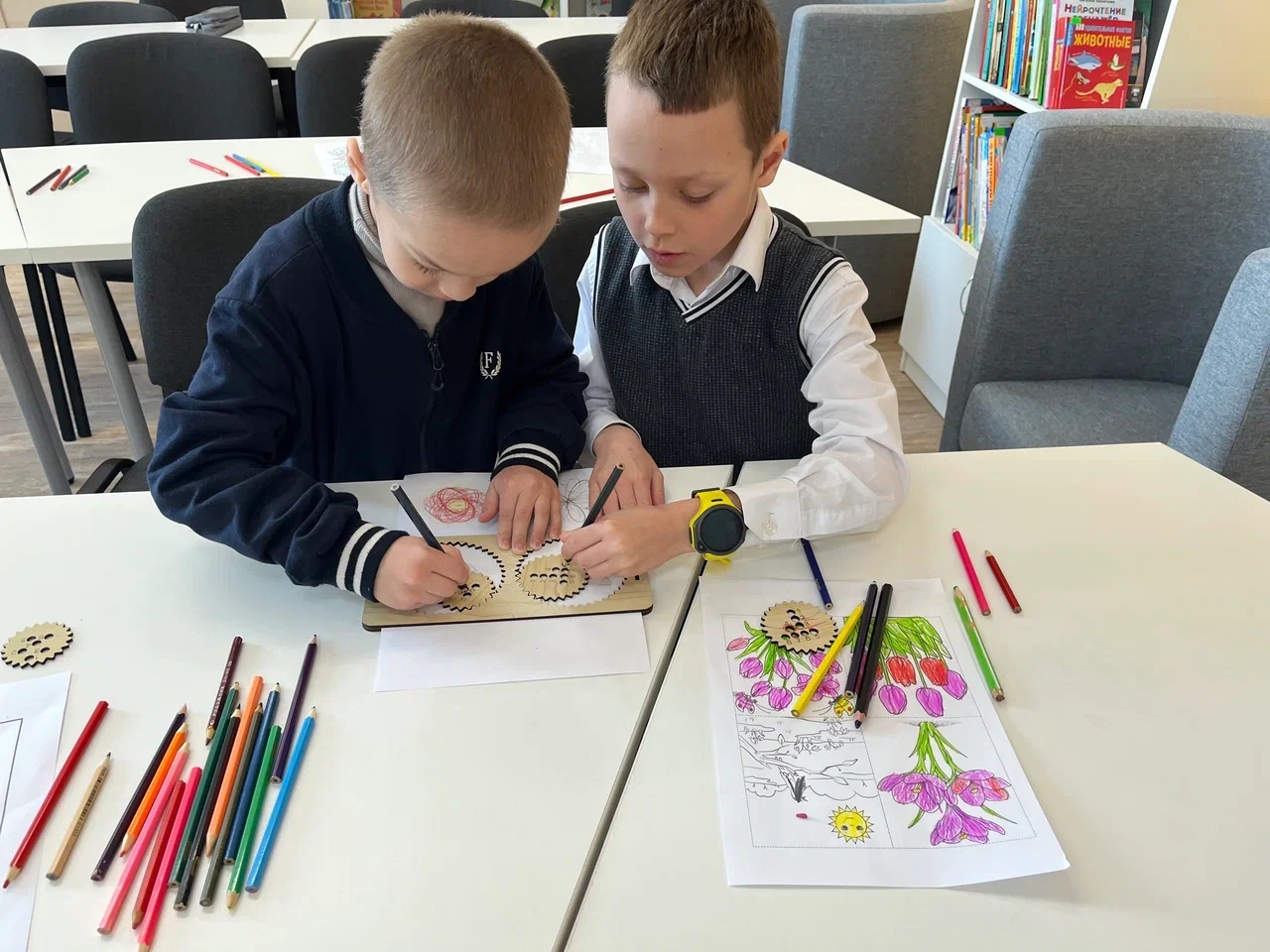 Юные гости активно участвовали в викторине, демонстрируя свои знания, с азартом играли в «Собери карандаши!», а потом освоили совершенно новую и увлекательную технику рисования. С помощью головоломки «Спирограф для двух рук» они создавали удивительные узоры, развивая при этом мелкую моторику и координацию.